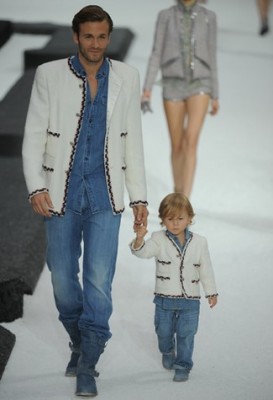 Na parte final, o momento transparências, muito preto e bordados formando desenhos Art Nouveau, em comprimentos midis, saias ajustadas ou amplas – aqui a técnica da alta-costura era mais que evidente. No meio disso tudo, a grande surpresa do dia, além da presença da ex-musa Inès de la Fressange e outras tops veteranas: um mini fashionista de mão dadas com seu pai, o ex-modelo Brad Kroenig usando looks idênticos! É o lançamento oficial da Chanel pour l’enfant?