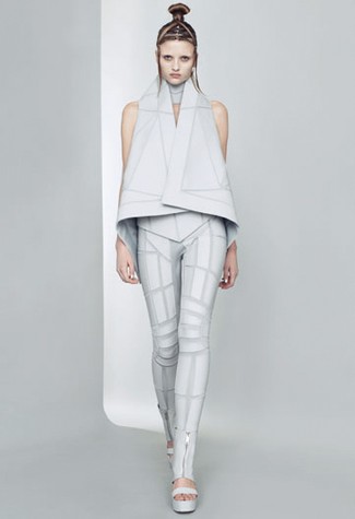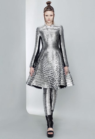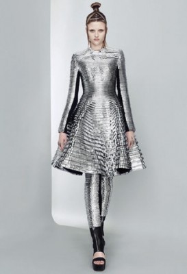 Gareth Pugh: um filme no lugar do desfile mostrou Kristen McMenamy (que voltou à ativa desde a última temporada) exibindo peças de formas arquitetônicas, de seda e tecidos texturizados, estampas gráficas, tons de cinza e preto e forte clima futurista, marca registrada de Pugh.