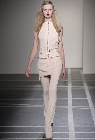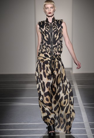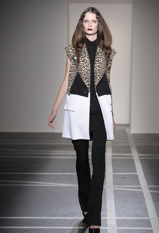 A silhueta era alongada com saias longas – algumas sobre calças retas – usadas com vestes e blusas de smoking sem mangas, adornadas por zíperes. Na cartela, preto e branco, nude e a estampa leopardo de sempre. Alguns looks também lembravam os anos 60 com túnicas sobre calças boot cut e tecidos mais estruturados, além de peças em rendas que apareceram em ótimas camisetas.