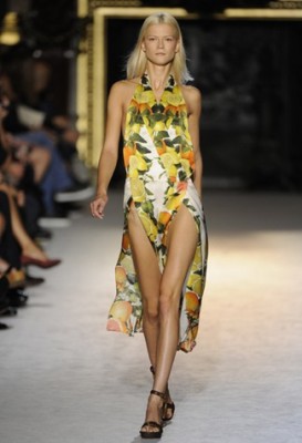 Stella McCartney: entre o sexy, o minimalismo e workwear, a estilista continua trabalhando as peças que têm feito sua fama mundo afora: a boa alfaiataria, que apareceu nos blazers mais largos e com colarinho de smoking, o jeans básico, em blusas de mangas amplas, vestidos retos e chemises, e os looks para eventos sociais representados por vestidos de cetim com fenda dupla frontal ou túnicas de estampas delicadas em cinza. Ela também sabe manter o bom humor, visto nas peças estampadas com frutas cítricas, única concessão às cores, já que a coleção foi formada basicamente de azuis, nudes e preto.