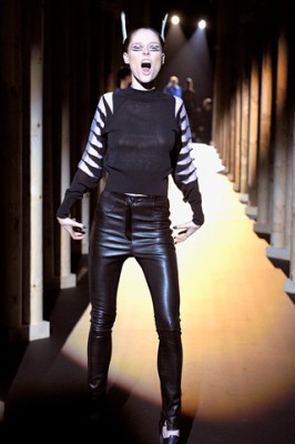 Numa passarela que lembrava uma catedral, as releituras dos ombros destacados e da silhueta ajustada lançada por Mügler fez bonito. Some-se a isso corselets, sutiãs expostos, cintura alta, macacões e muitas transparências, além de tecidos sintéticos como látex e detalhes de pele. Na cartela, muito preto, vermelho, azul cobalto e branco. Engraçado mesmo foi ver modelos como Coco Rocha e Jessica Stam bancando as “tigresas” pra plateia e Lady Gaga dando lição de como se equilibrar nas enormes plataformas, coisa que nem toda modelo conseguia.