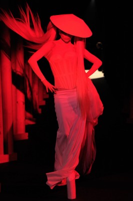 Não foi só a presença de Lady Gaga desfilando na nova versão da Thierry Mügler que tornou o show um dos mais concorridos da semana parisiense. Nicolas Formichetti trouxe de volta aqueles desfiles divertidos dos anos 80, com as modelos fazendo caras e bocas pros fotógrafos, talvez por influência direta de Gaga, que apareceu no pit, fumando e fazendo sua performance de sempre.