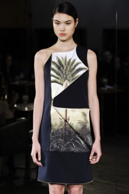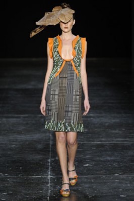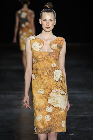 Fernanda Yamamoto: misturando natureza e Hello Kitty, que quase passa despercebida nas estampas marrons, a coleção teve muitos tons terrosos, um pouco de turquesa e laranja, vestidos molengos pelos joelhos e várias texturas.