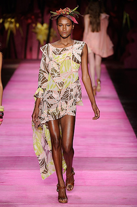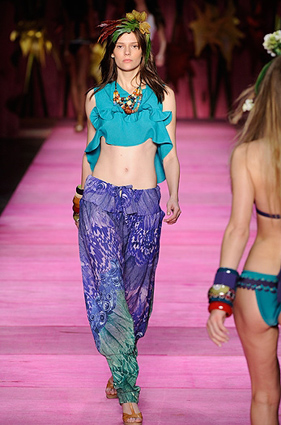 Embora a modelagem seja bastante variável, o tamanho menor predominou na parte de baixo dos biquínis; já os sutiãs, em sua maior parte formados por cortininhas e faixas, apareceram com detalhes de babados e franzidos, que deram um ar um pouco mais romântico às peças. Para sair da areia, vestidos longos e mínis, calças sarouel e mais macacões – com certeza, uma tendência fortíssima para a próxima estação.