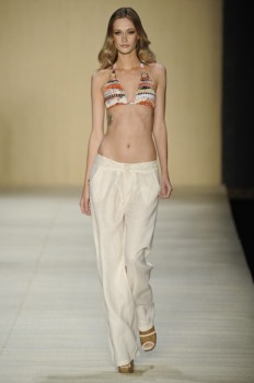 Na paleta de cores, tons terrosos dividiram espaço com azuis, preto, branco e estampa de onça. Os biquínis apresentaram calcinhas maiores, mais largas e comportadas, enquanto os maiôs vieram com recortes estrategicamente localizados. As saídas de praia oscilaram entre vestidinhos, saias compridas e esvoaçantes, calças folgadas e jaquetas.