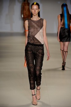Helmut Lang, estilista austríaco ícone do minimalismo do final dos anos 80 e início dos 90, também foi uma das inspirações para esta coleção, em que formas simples e geométricas predominaram. O destaque ficou por conta dos tecidos, que apareceram sem estampas e foram embelezados por cortes super precisos. Além da seda, muitos tecnológicos, como fibra de papel e fibra lamê plastificada. Transparência e sobreposição foram outros pontos fortes desta coleção com ares futuristas.