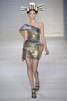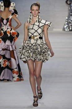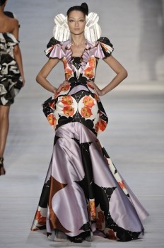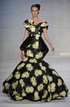 Os vestidos curtos traziam assimetrias e babados estruturados, formando flores na região do busto, nas alças ou nos quadris. Já os longos, que de tão pesados dificultavam o caminhar das modelos, tinham várias camadas de anáguas e ainda mais volume. Alguns lembravam modelos de Balenciaga, lá dos anos 50. Outro destaque foi o uso de paetês, algo inédito em seu trabalho, bordando vestidos em dourado e prateado. Na cartela, verde limão, pink e estampas gráficas ou de flores tropicais.