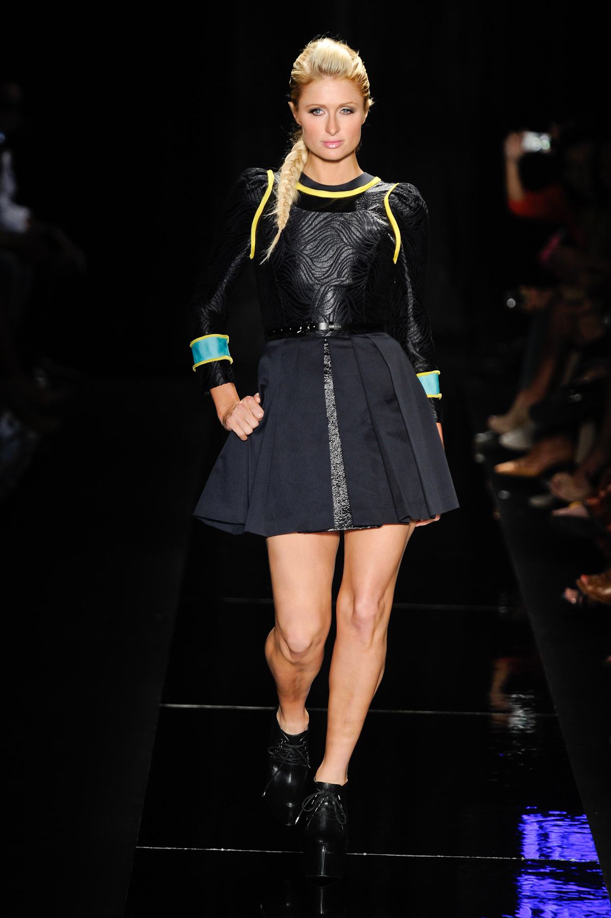 Finalmente, Paris Hilton foi a sensação da noite, em sua segunda passagem pela Triton. A estilista Karen Fuke vem acertando o passo, formando uma nova identidade para a marca. Entre os looks com cara vintage (com aplicações de peles) e os mais tecnológicos, com tecidos matelassados, vale mencionar os com estampas florais metalizadas nas blusas, mini saias e vestidos.