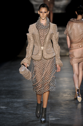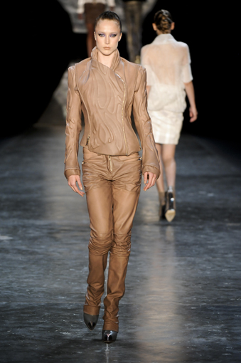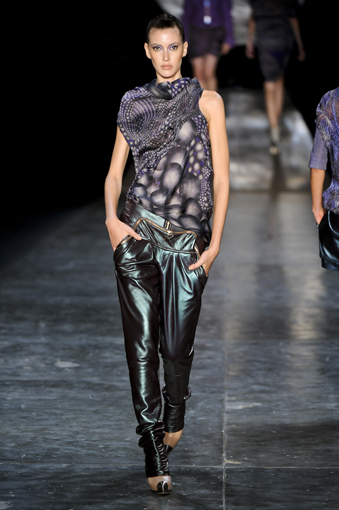 Muitas barbatanas criaram jaquetas (e golas e bolsos) com movimentos e volumes tridimensionais futuristas. E outras jaquetas, conta o release, foram feitas em lã moldada a vácuo! A tecnologia não acaba por aí: uma parceria com a Basf resultou num acabamento termocrômico, que reage com a temperatura do corpo alterando sua cor. O confuso release fala ainda de fragilidade, exteriorização e interiorização, mas o que se vê na passarela são mulheres no mínimo ousadas. E poderosas.