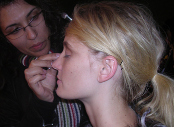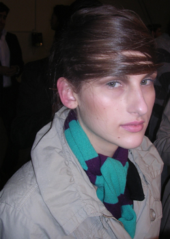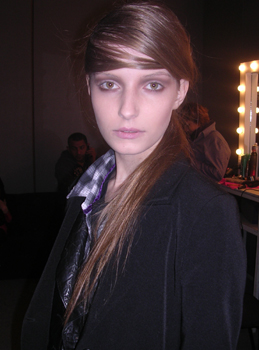 Henrique teve então que adaptá-la para a estação, e ao invés de usar maquiagem preta, optou por usar tons de marrrom, fazendo com sombra o efeito de olheiras, para dar um ar barroco. Nos lábios, foi usado apenas um batom cor-de-boca. O cabelo tinha uma textura bem suja, rústica, em formato de toquinha com acabamento em rabo de cavalo. Para dar esse efeito, ele explica: “Usei spray e mousse”.