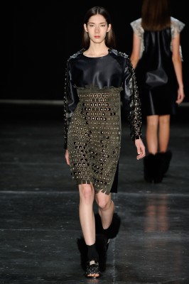 Jefferson Kulig focou nas texturas, com peças lembrando armaduras, couros vazados e tecidos tecnológicos, enquanto as formas eram mais tradicionais e ajustadas.