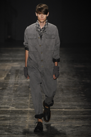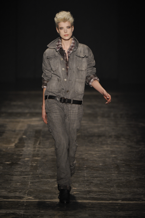 Os “hard workers” da Ellus vestem jeans, é claro, a maioria em lavagens cinzentadas e detonadas. Muitos casacos pesados e pretos, tanto para ele como para ela, trench-coats e sobretudos quentinhos, fora as inúmeras jaquetas, em Black jeans e couro. As jardineiras vistas de costas parecem calças com suspensórios. As barras de calças, bermudas e shorts são viradas. Alguns modelos aparecem com um avental estiloso.