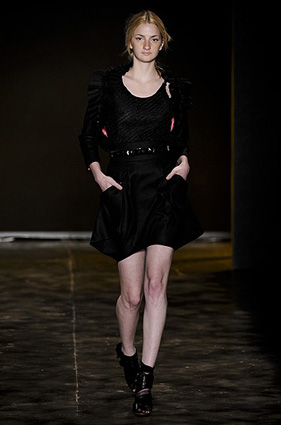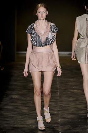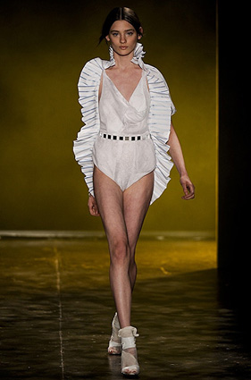 O desfile de Erika começou com aquilo pelo o que a estilista é conhecida: dobradura em tecido, dando formas e graça às peças. E elas vieram emoldurando golas, barras de blazeres e de saias, nos detalhes das blusas. A cintura de saias e bermudas é mais alta e o volume das primeiras é arredondado, num leve balonê ou no formato tulipa, enquanto o comprimento fica acima dos joelhos.