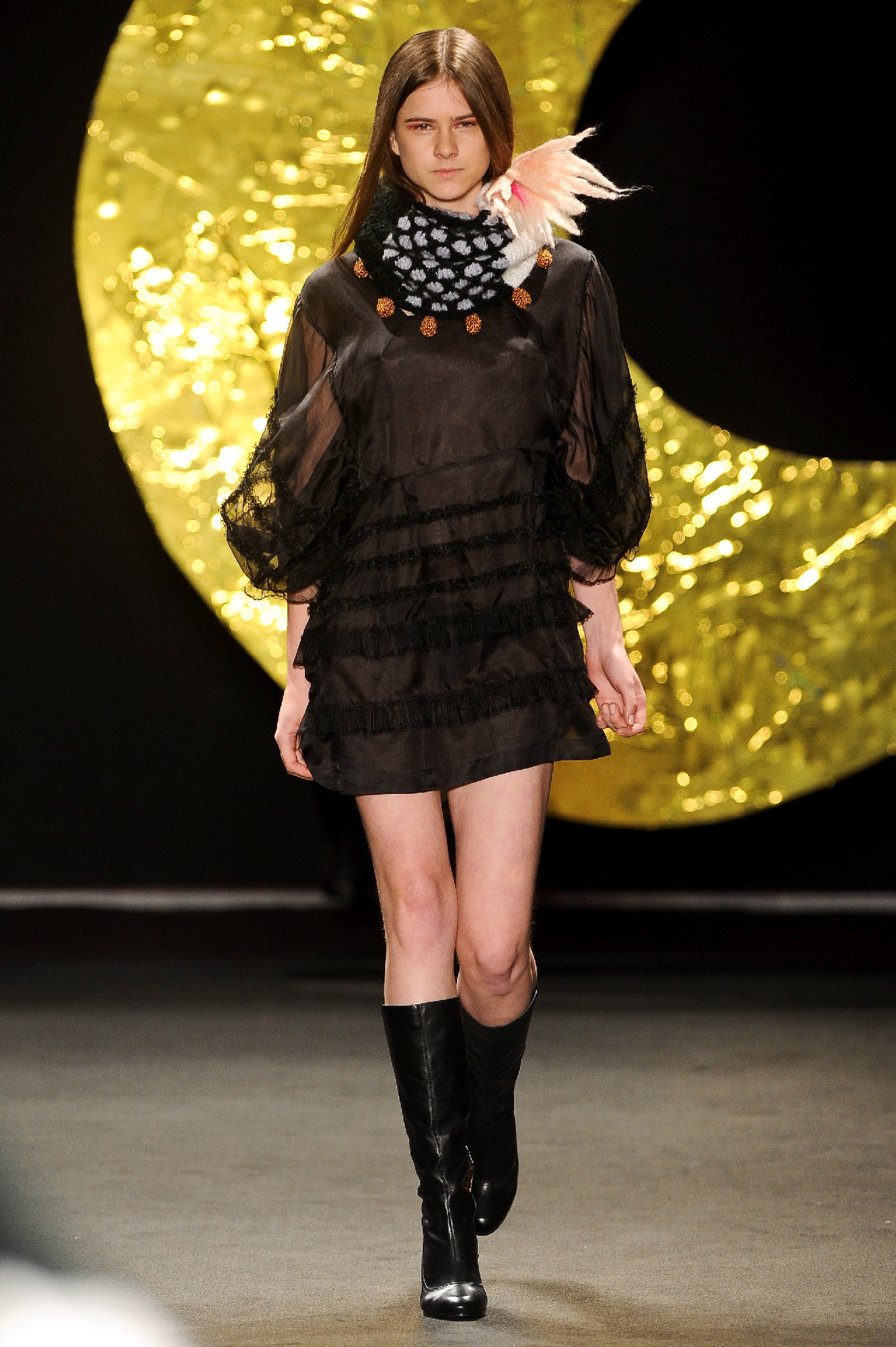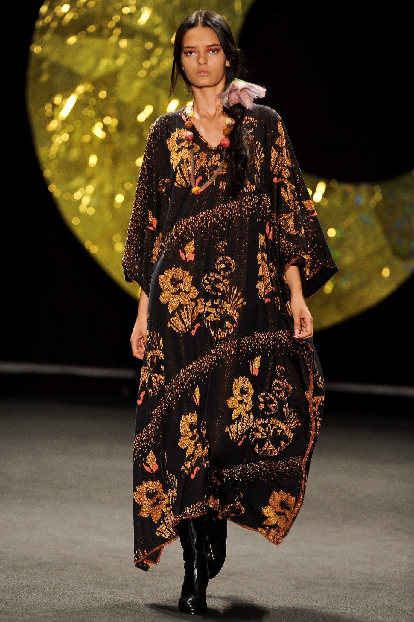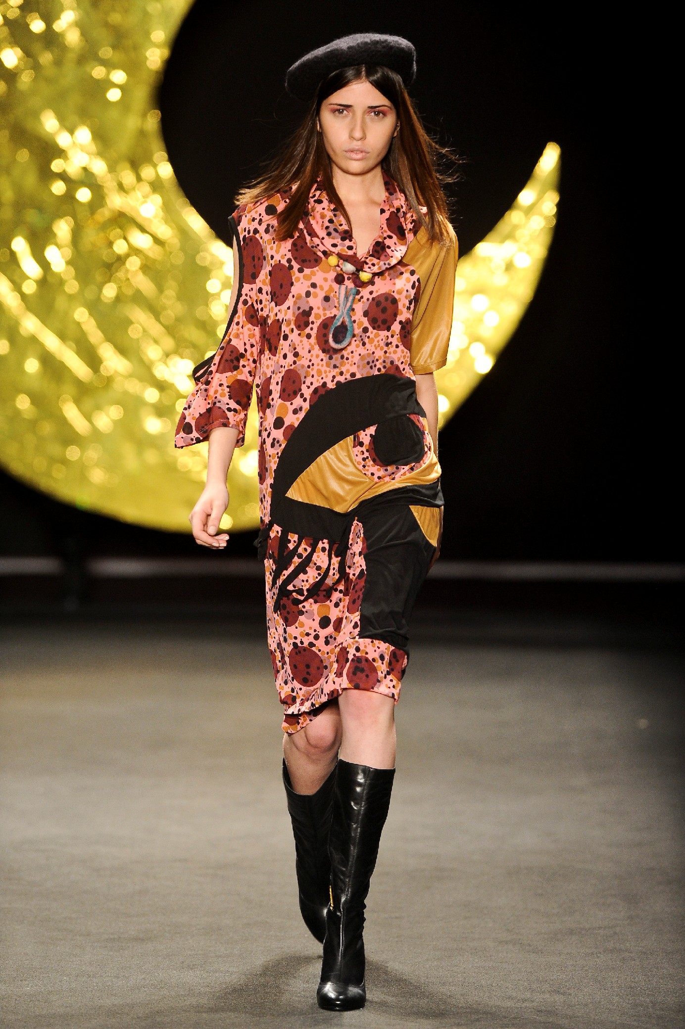 Os vestidos longos tinham formas amplas e confortáveis como caftãs. Aplicações douradas permearam a coleção, em forma de tachinhas e botões. Botas pretas de cano longo apareceram na maioria dos looks. O xadrez (que, como o preto, tem marcado presença nesta edição) compareceu, e divertidos bordados (lua, olho egípcio) deram humor a peças rosas. No fundo da passarela, de onde saíam as modelos, uma lua enorme dourada era segurada por alguém que não resistiu e dançou durante o colorido desfile de Fabia.