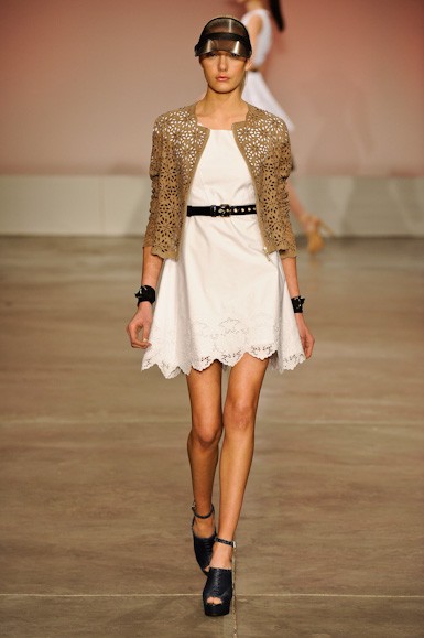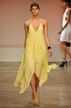 Porém, o que mais se viu foram vestidos e saias, entre os fluidos, mais estruturados ou com amarrações frontais e uma certa influência esportiva presente nas blusas de listras, calças cenoura e viseiras. Um bom detalhe foi o uso de cintos de duas cores, marcando a cintura. Na cartela, preto, branco, caramelo e alguns poucos toques de amarelo.