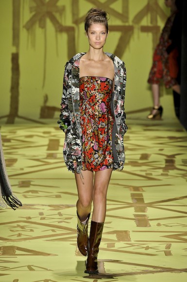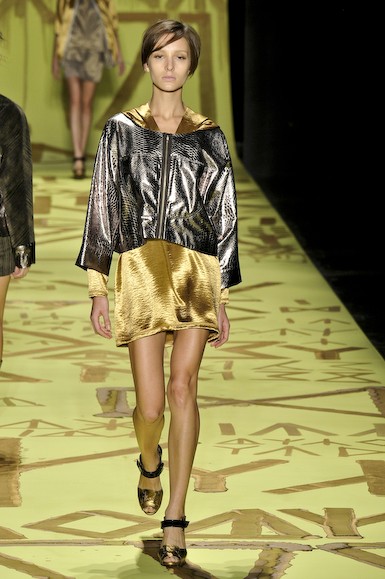 Mesmo assim, o outono/inverno da marca não deixa de ser sofisticado, graças às peças em dourado, e, bem feminino, com estampas florais e vestidos curtos. O desfile abriu com camisetas estampadas com números e calça largona, teve peças de renda, como leggings e micro saias usadas em sobreposições, algumas na padronagem clássica pied-de-poule e fechou com micro comprimentos em tecidos mais leves e brilhosos, em cores como pink, vermelho, prata e cinza. Nos pés, botas tipo galochas completaram uma coleção cheia de objetos de desejo.