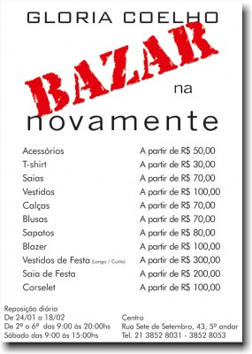 A Novamente estará promovendo durante os dias 24 e 18 de fevereiro um Bazar com peças ícones da estilista Gloria Coelho.
