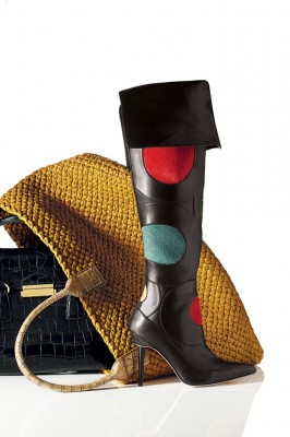 Bolsas de couro da Prada e com trançados da Bottega Veneta, bota de Manolo Blahnik