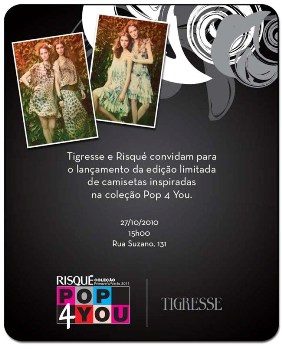 Ótimo programa para esta quarta: a Tigresse, junto com a Risqué, promove um chá de esmaltes (às 15h) para quem quiser passar uma tarde gostosa, no meio de roupas incríveis e cores POP de esmalte. E para comemorar a ocasião e parceria, a Tigresse está lançando uma linha de t-shirts inspiradas nas cores dos esmaltes Pop 4 You da Risqué em parceria com Reinaldo Lourenço. O Buffet Brilat Gourmet, da chef Carla Elage, será responsável pelas delícias que as convidadas vips das marcas irão degustar, como os mini cupcakes de chocolate, banana e laranja, mini pot pies e drinks inspirados na coleção de esmaltes.