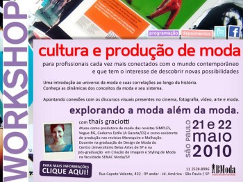 Nos dias 21 e 22 de maio, acontecerá em São Paulo o Workshop “Cultura e Produção de Moda”, para profissionais que querem estar cada vez mais conectados com o mundo contemporâneo e que têm o interesse de descobrir novas possibilidades. Uma introdução ao universo da moda e suas relações ao longo da história, apontando conexões com os discursos visuais presentes no cinema, fotografia, vídeo, arte e moda. O curso será ministrado por Thaís Graciotti, que atuou como produtora de moda das revistas Simples, Vogue RG, Caderno Estilo (Gazeta/ES) e como assistente de produção nas revistas Manequim e Malhação.