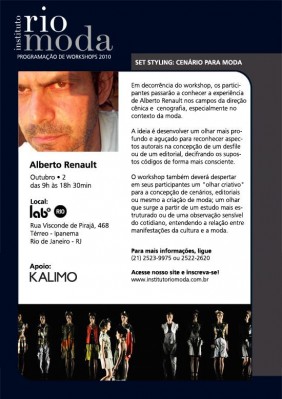 Com intuito de motivar os participantes a desenvolverem um olhar mais profundo e aguçado para reconhecer aspectos autorais na concepção de um desfile ou editorial, o Instituto Rio Moda promove no próximo dia 2 de outubro, o workshop de Set Styling: Cenário para Moda com Alberto Renault.
