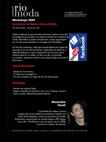 No próximo dia 30 de maio, o Instituto Rio Moda promove o workshop “Jornalismo de Moda e Novas Mídias”, com a jornalista Alexandra Farah, do site FilmeFashion. Os participantes vão conhecer os recursos tecnológicos que ajudam em uma cobertura dinâmica e as ferramentas necessárias para a atualização de um blog. Entre os temas abordados estão: a Moda em movimento, o meio e a mensagem, e a era da curadoria no lugar da era da informação. O workshop acontece no dia 30 de maio, das 9h às 18h. Mais informações no site www.institutoriomoda.com.br