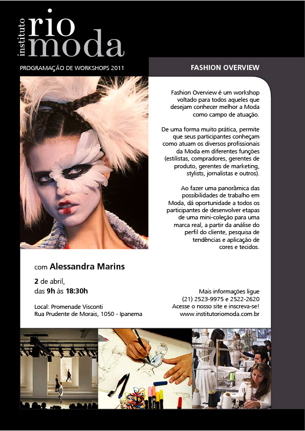 No dia 2 de abril, o Instituto Rio Moda promove o workshop “Fashion Overview”, com Alessandra Marins. O curso é voltado para todos aqueles que desejam conhecer melhor os campos de atuação em Moda. Os participantes observarão como atuam os diversos profissionais da área – estilistas, compradores, gerentes de produto, gerentes de marketing, stylists, jornalistas e outros – e terão a oportunidade de desenvolver etapas de uma mini-coleção para uma marca real, a partir da análise do perfil do cliente, pesquisa de tendências e aplicação de cores e tecidos.