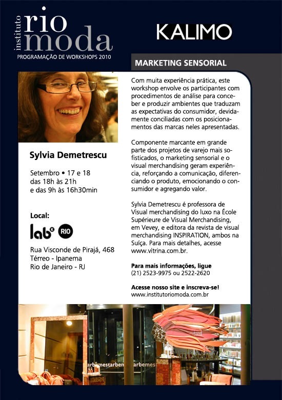 Nos próximos dias 17 e 18 de setembro, o Instituto Rio Moda realiza mais uma edição do workshop de Marketing Sensorial com Sylvia Demetresco, que reúne grande experiência neste campo e conduzirá os trabalhos de forma leve e prática. Para este workshop, o Instituto formou uma parceria com a Kalimo que cedeu um espaço privilegiado no coração de Ipanema para a realização do curso.