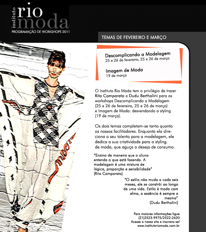 O Instituto Rio Moda traz para seu calendário de workshops uma dupla brilhante: Rita Comparato e Dudu Bertholini. Os estilistas se completam cada um na sua especialidade, Rita na modelagem e Dudu no styling. E para transmitir um pouco deste talento aos novos estilistas, eles ministram os workshops “Descomplicando a Modelagem” (25 e 26 de fevereiro, 25 e 26 de março) e “Imagem e Moda: Desvendando o Styling” (19 de março).